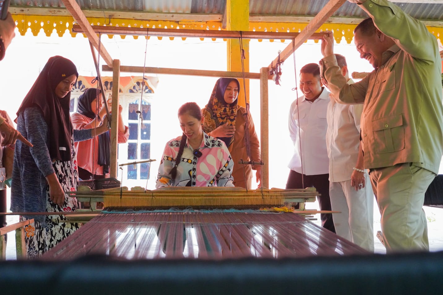 Pada kunjungan tersebut, Ibu Ain turut mencoba secara langsung proses menenun bersama para pengrajin. Ia mengungkapkan kekagumannya terhadap proses pembuatan kain songket yang penuh ketelitian.