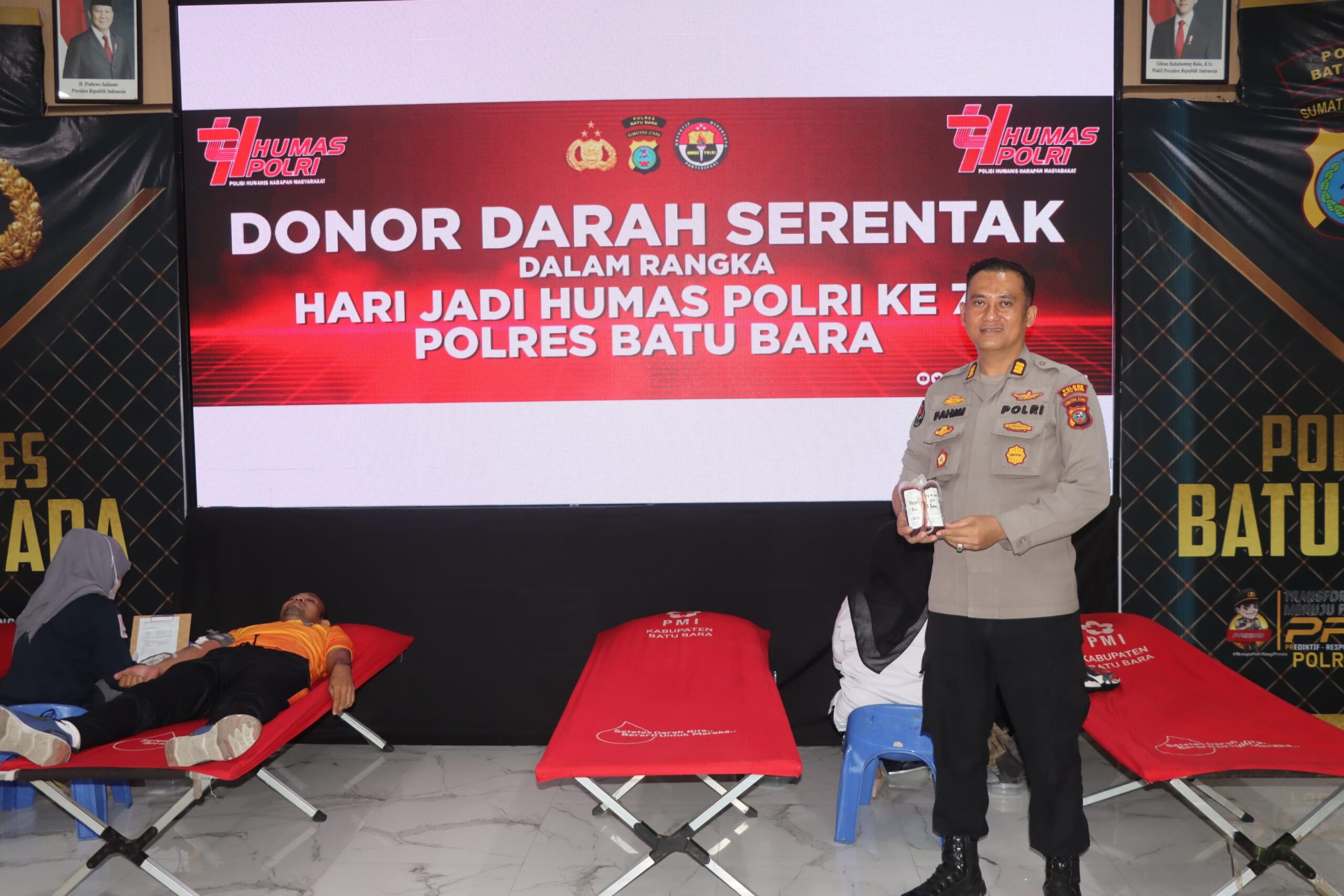 Pelaksanaan giat donor darah Polres Batu Bara bekerja sama dengan PMI Batu Bara dalam rangka hari jadi Humas Polri ke-74 tahun 2025.