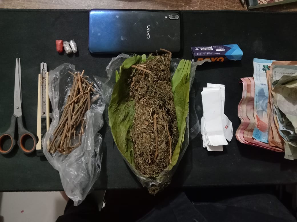 Dari hasil penggeledahan, ditemukan barang bukti berupa 1 bungkus besar daun ganja kering dengan berat brutto 75,92 gram, 3 bungkus kecil daun ganja kering dengan berat brutto 1,51 gram, 1 bungkus plastik berisikan ranting daun ganja, 1 unit handphone merk Vivo, 1 buah gunting, 1 buah pisau, 87 lembar kertas rokok (royo), serta uang tunai sebesar Rp623.000.