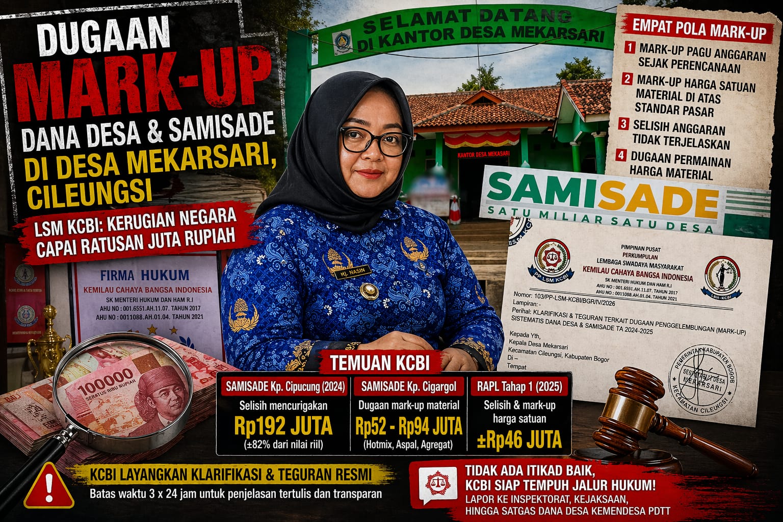 BOGOR | Sumutmerdeka.id – Dugaan praktik penggelembungan anggaran (mark-up) kembali mencuat di Kabupaten Bogor. Kali ini, sorotan mengarah ke Pemerintah Desa Mekarsari, Kecamatan Cileungsi, setelah Lembaga Swadaya Masyarakat Kemilau Cahaya Bangsa Indonesia (LSM KCBI) mengungkap indikasi kerugian negara dalam pengelolaan Dana Desa dan program SAMISADE Tahun Anggaran 2024–2025.