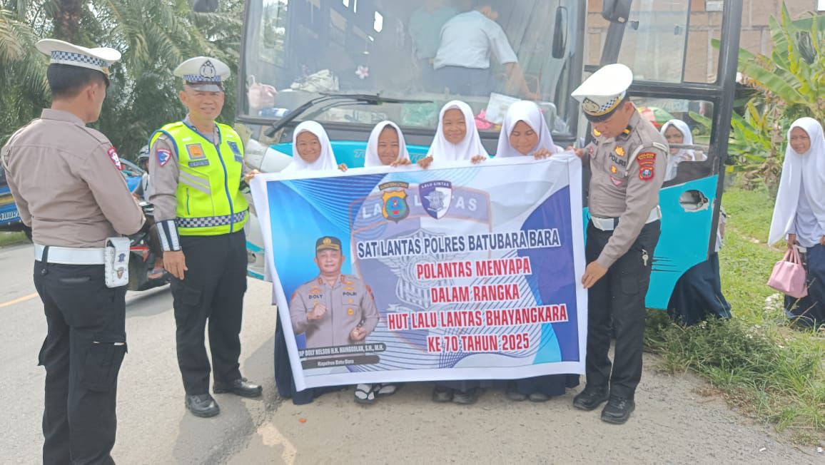 BATU BARA | Sumutmerdeka.id – Satlantas Polres Batu Bara melaksanakan kegiatan “Polantas Menyapa” dengan memberikan sosialisasi dan edukasi tertib berlalu lintas kepada siswi SMP Negeri 1 Lima Puluh dan supir bus pada Senin, 8 September 2025