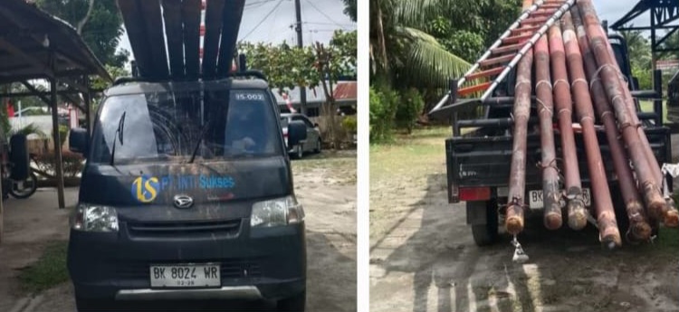 7 (tujuh) batang tiang Telkom dan 1 unit tangga serta mobil Pikup Grand Max BK 8025 WR.