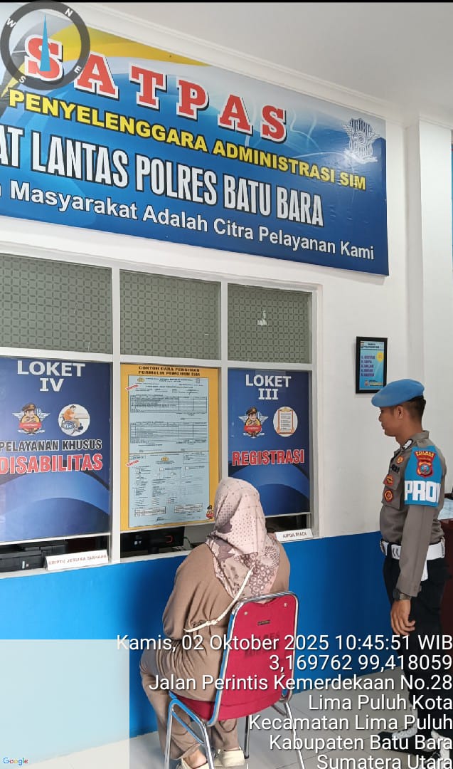 Sipropam Polres Batu Bara melaksanakan kegiatan pengawasan terhadap personil yang bertugas di pelayanan publik, yaitu pelayanan SIM dan SKCK. Kegiatan ini diselenggarakan pada Rabu, 2 Oktober 2025, pukul 10.00 WIB, di Jalan Perintis Kemerdekaan No.28 Lima Puluh Kota Kec Lima Puluh.