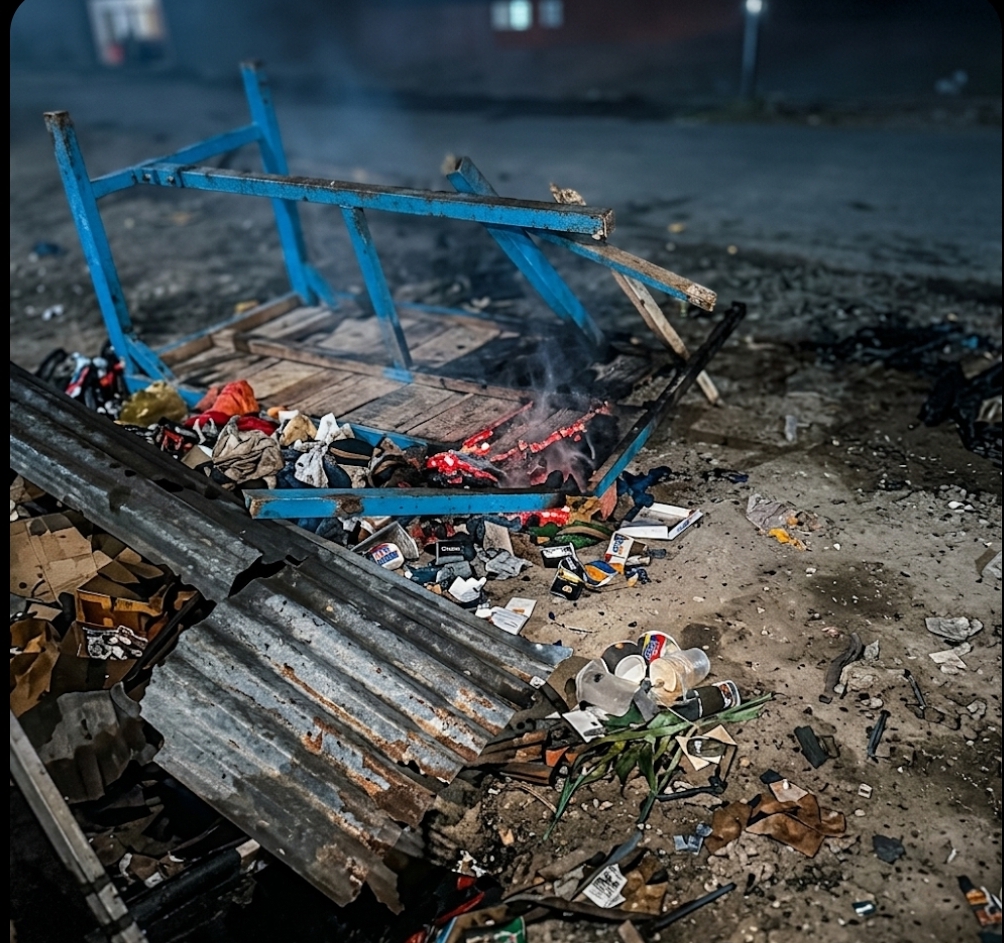Peristiwa aksi anarkis tersebut semakin meresahkan, dan membakar Gerobak milik Pedagang Kaki Lima (PKL) tersisa puing-puing kayu terbakar.
