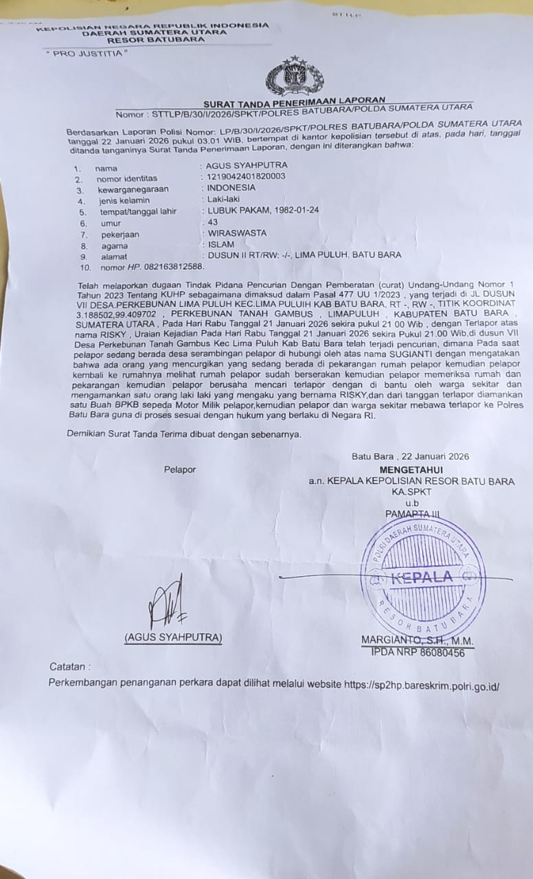 BATU BARA | Sumutmerdeka.id – Kasus pencurian diamankan warga setelah diduga beraksi di tiga rumah dalam satu malam di Desa Perkebunan Lima Puluh Pasar I Kecamatan Lima Puluh, Kabupaten Batu Bara Sumatera Utara, Kamis (22/1/2026) sekitar pukul 01.00 Wib dini hari.