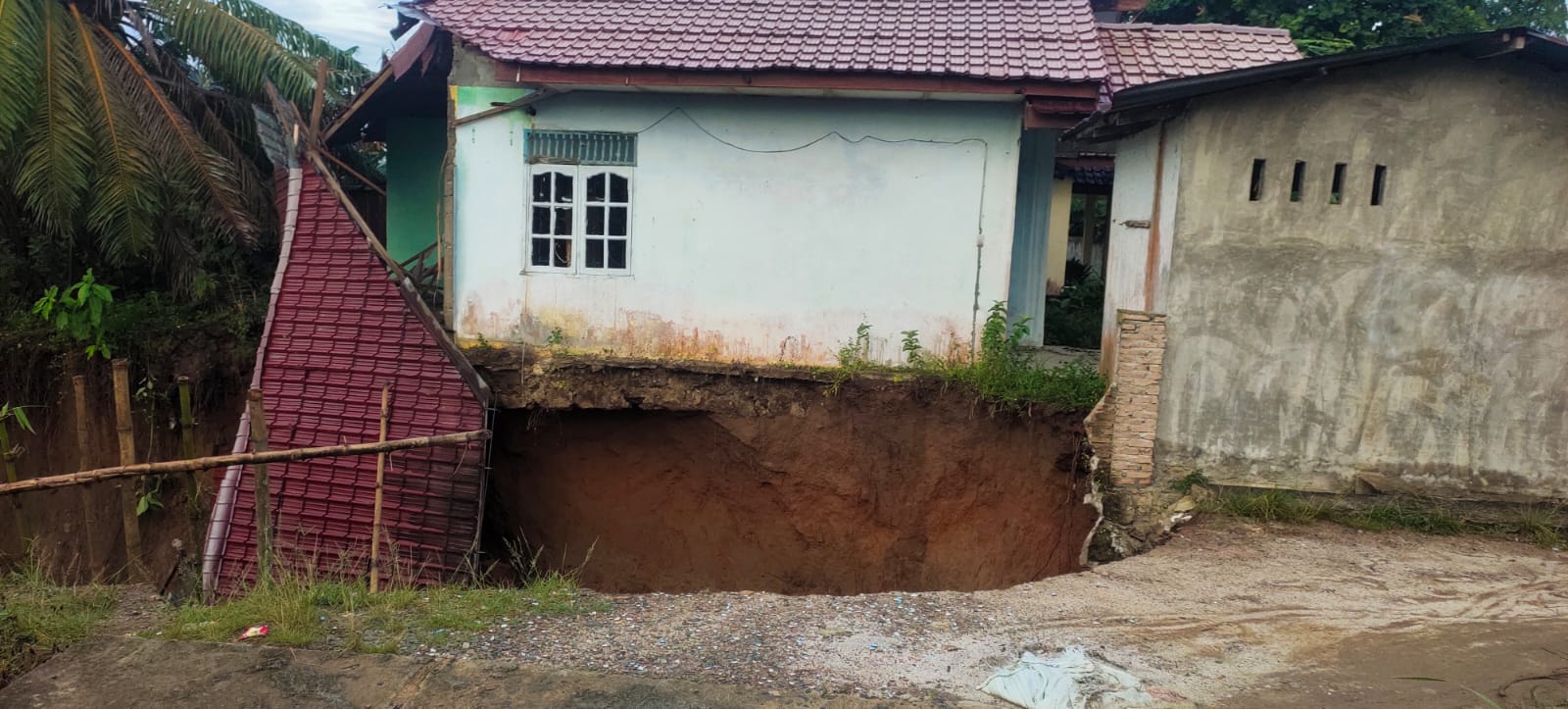 “Tanah longsor sudah menelan satu rumah yang ambruk ke dalam jurang sedalam enam meter. Akses jalan juga terputus karena longsor semakin meluas,” ujarnya.